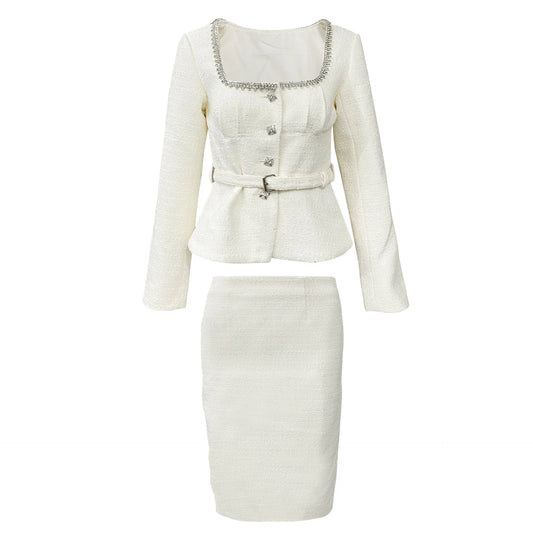 Luxury Quality Autumn White Tweed Two Piece Set Women Long Sleeve Beading Jackets Long Skirts Suits Office Lady Work Wear Coats