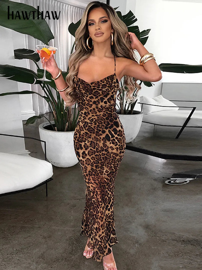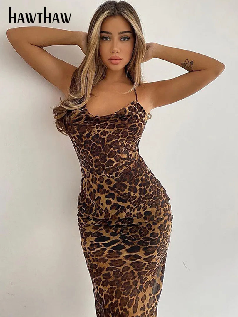 Hawthaw Women Autumn Winter Sleeveless Leopard Printed Bodycon Long Straps Dress Streetwear 2021 Fall Clothes Wholesale Items