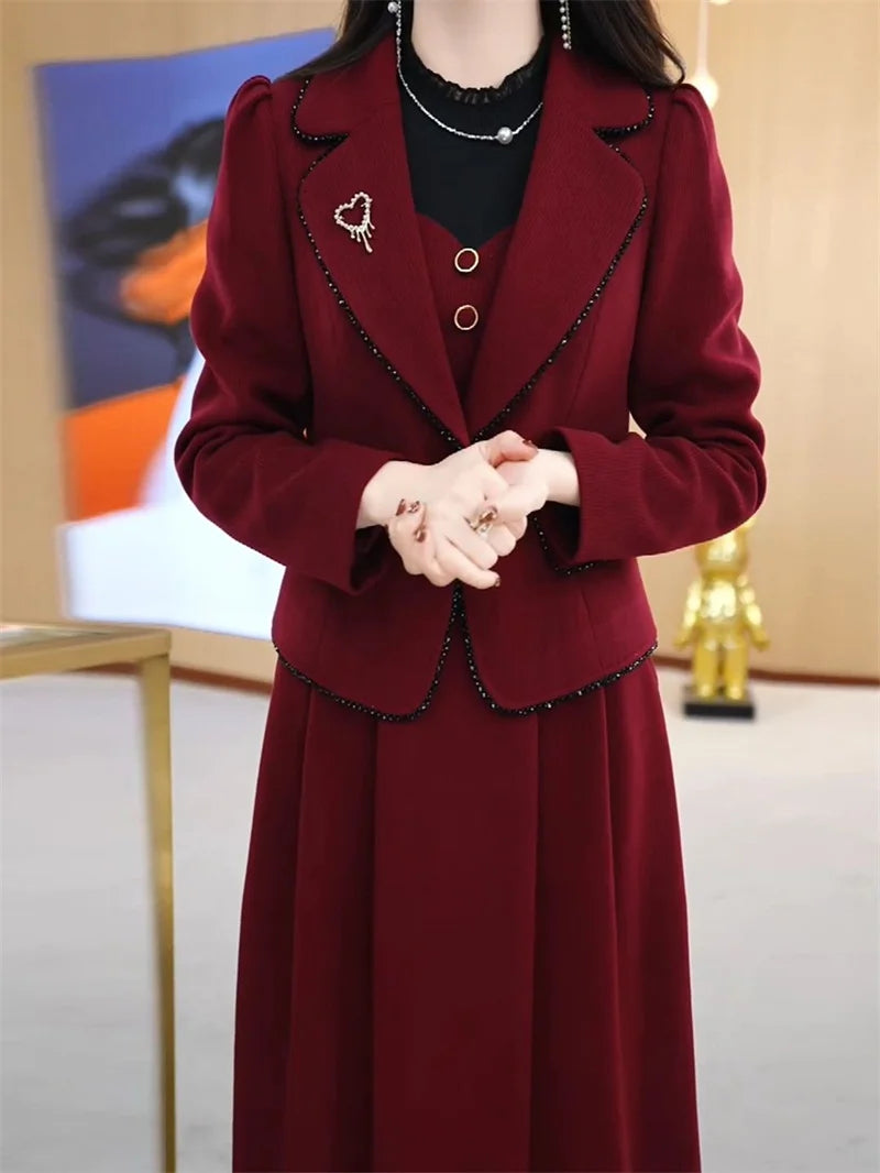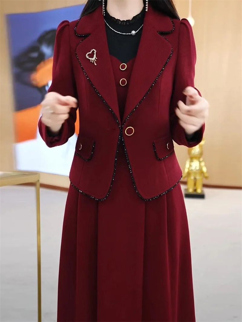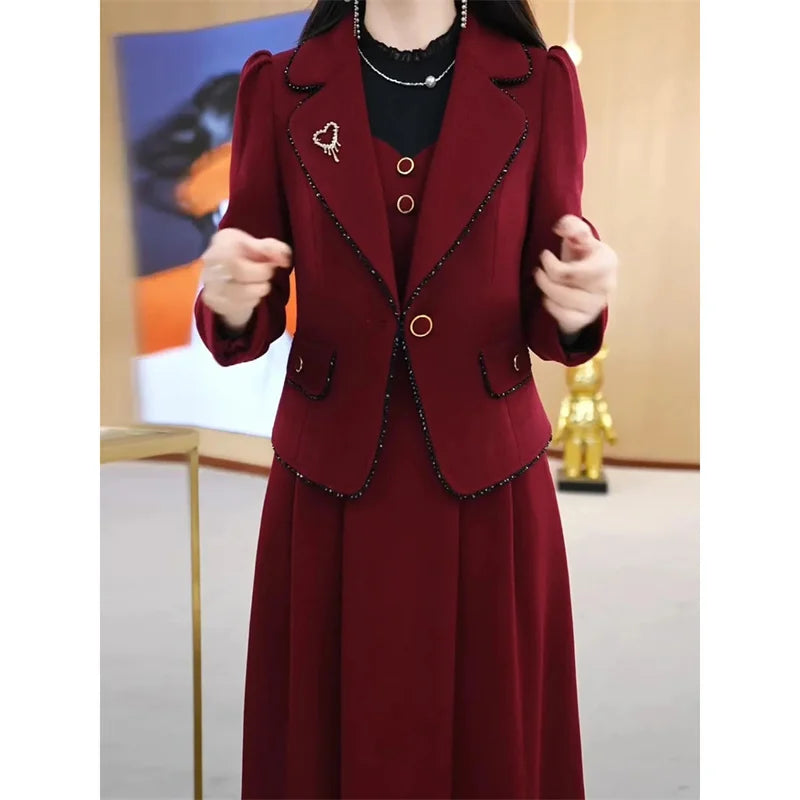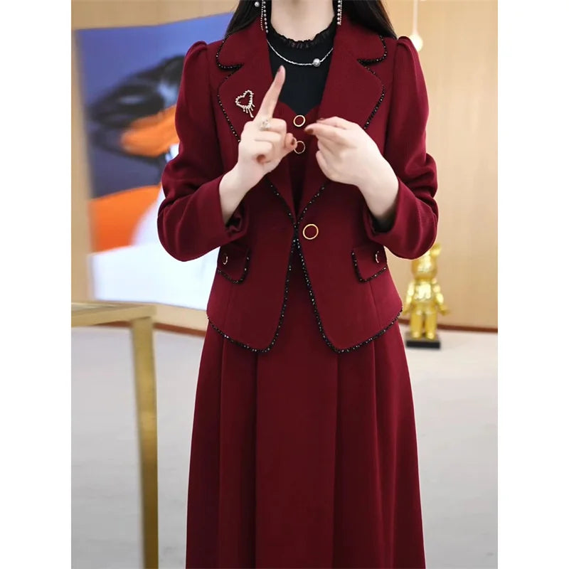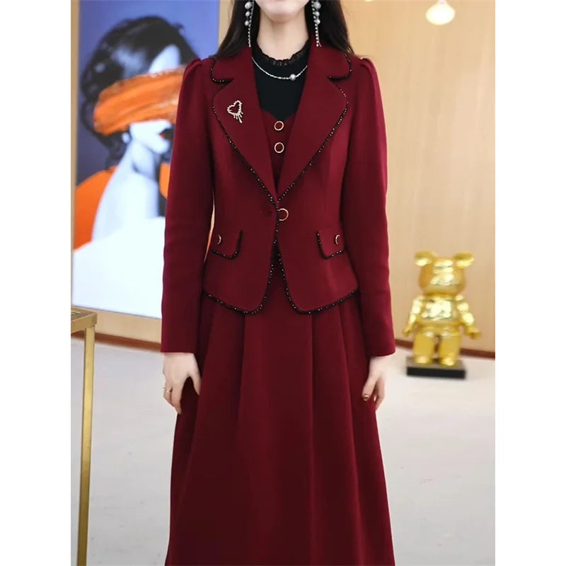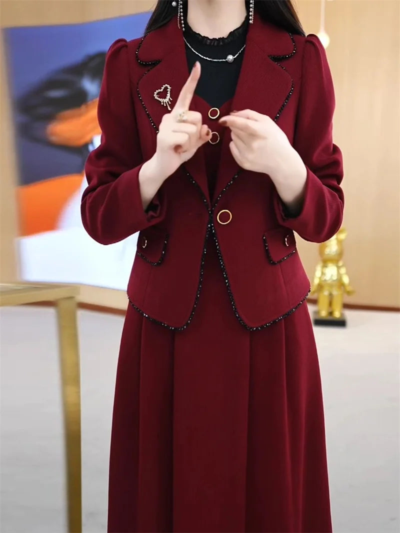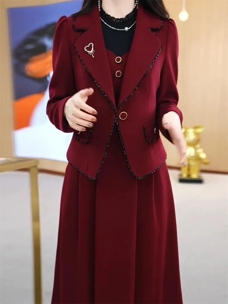 High End Suit Jacket Dress Two-piece Set Women 2024 Spring Autumn Winter New Advanced Red Blazer Coat Long Dress Female Outfit
