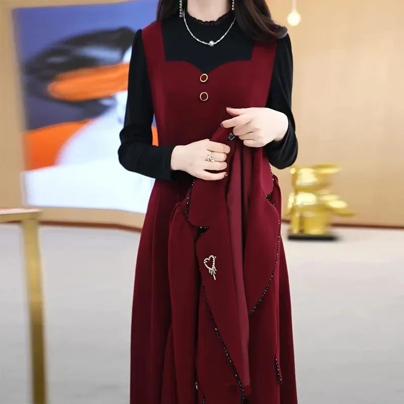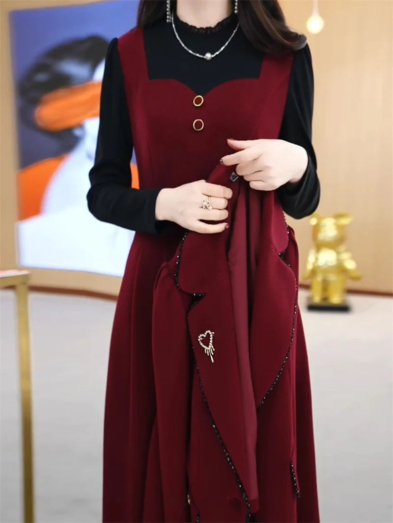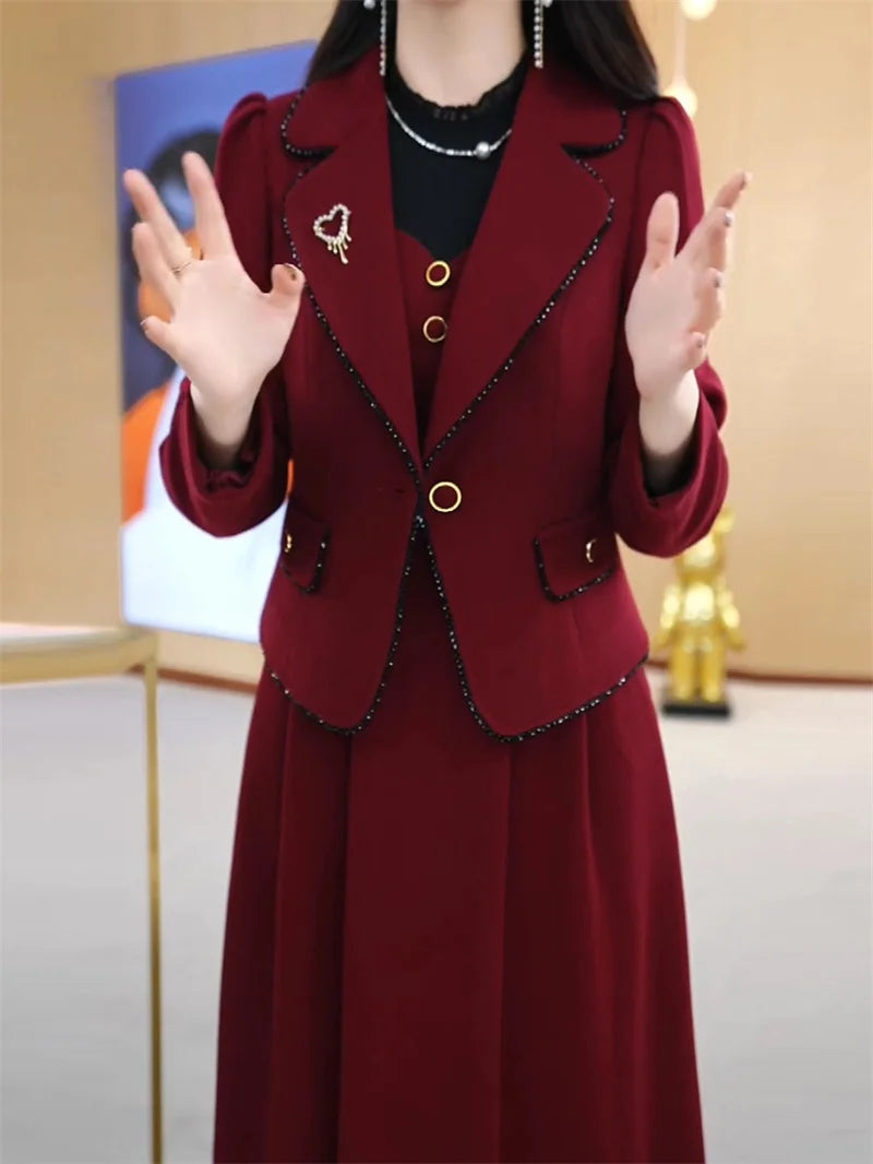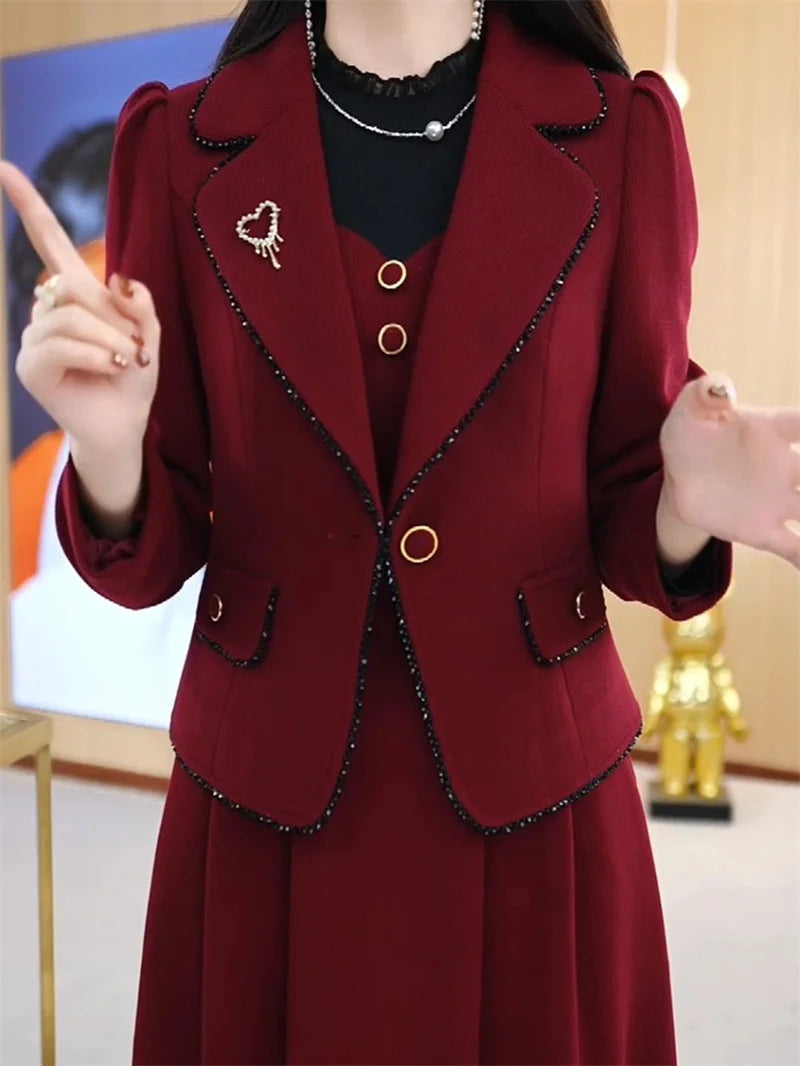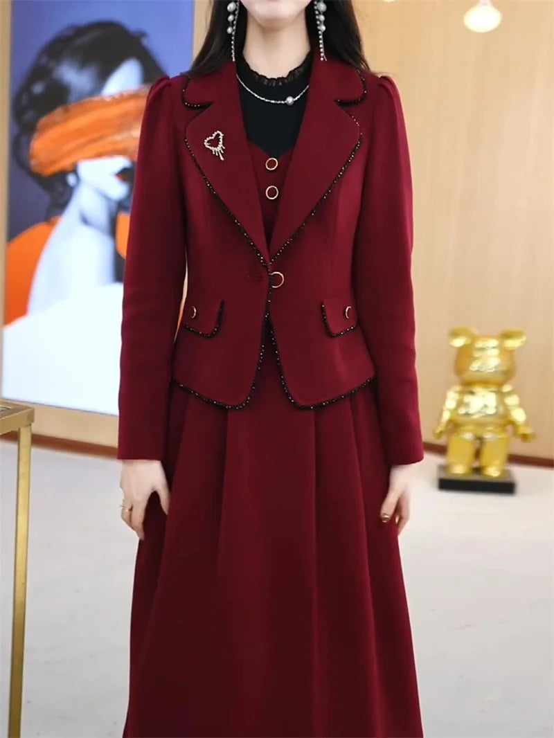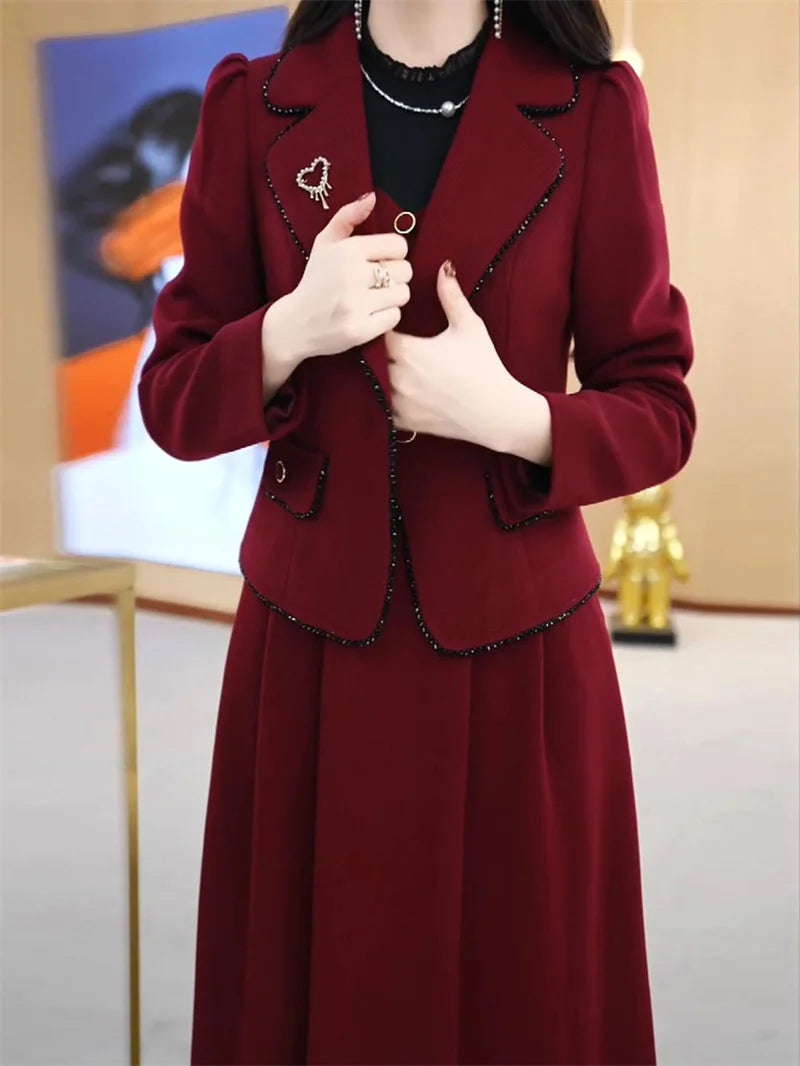 High End Suit Jacket Dress Two-piece Set Women 2024 Spring Autumn Winter New Advanced Red Blazer Coat Long Dress Female Outfit