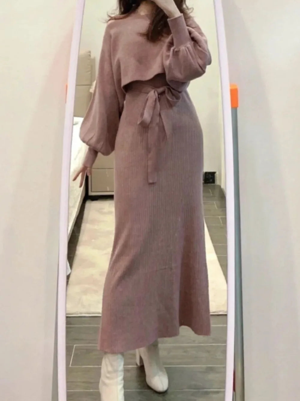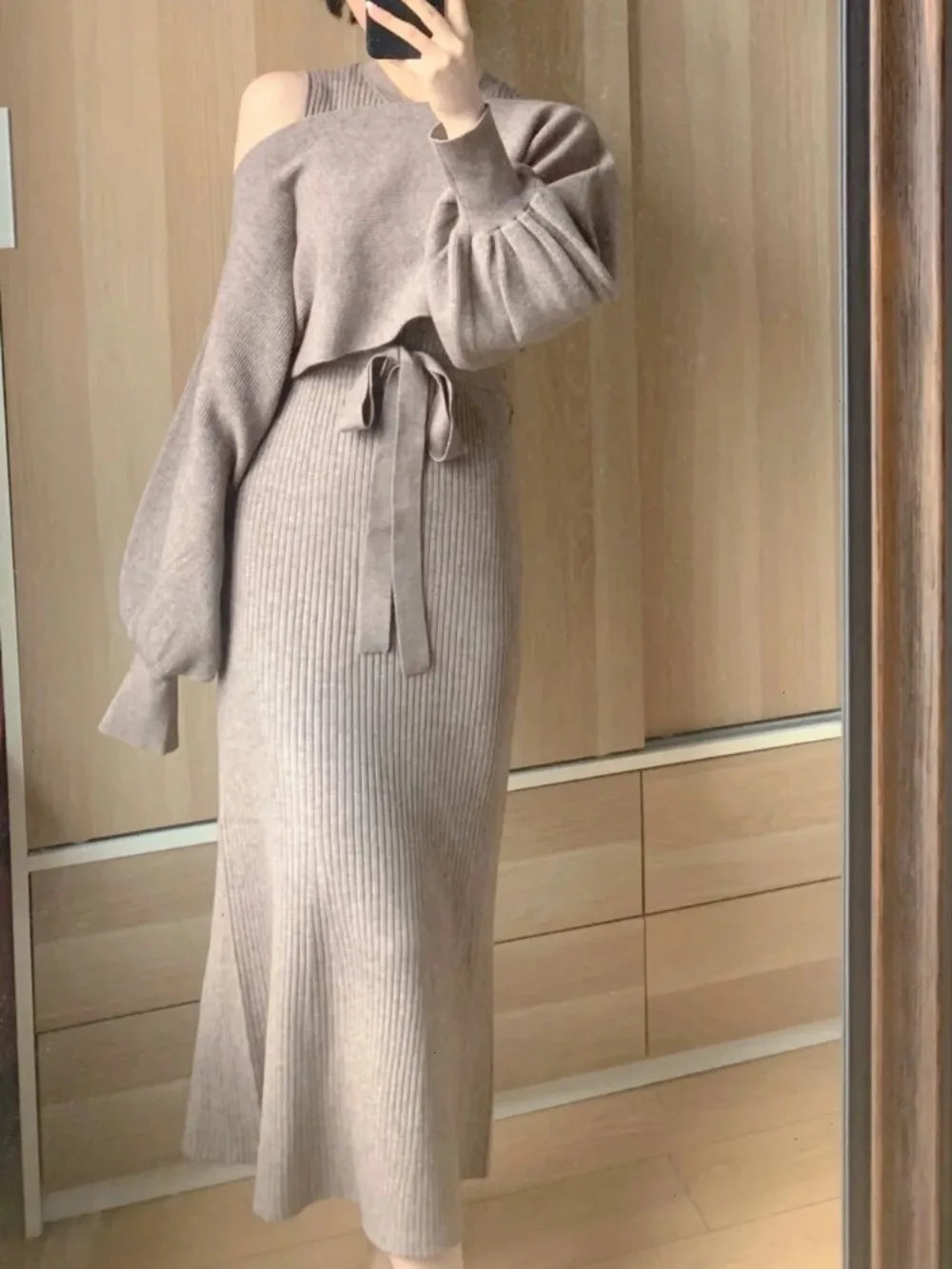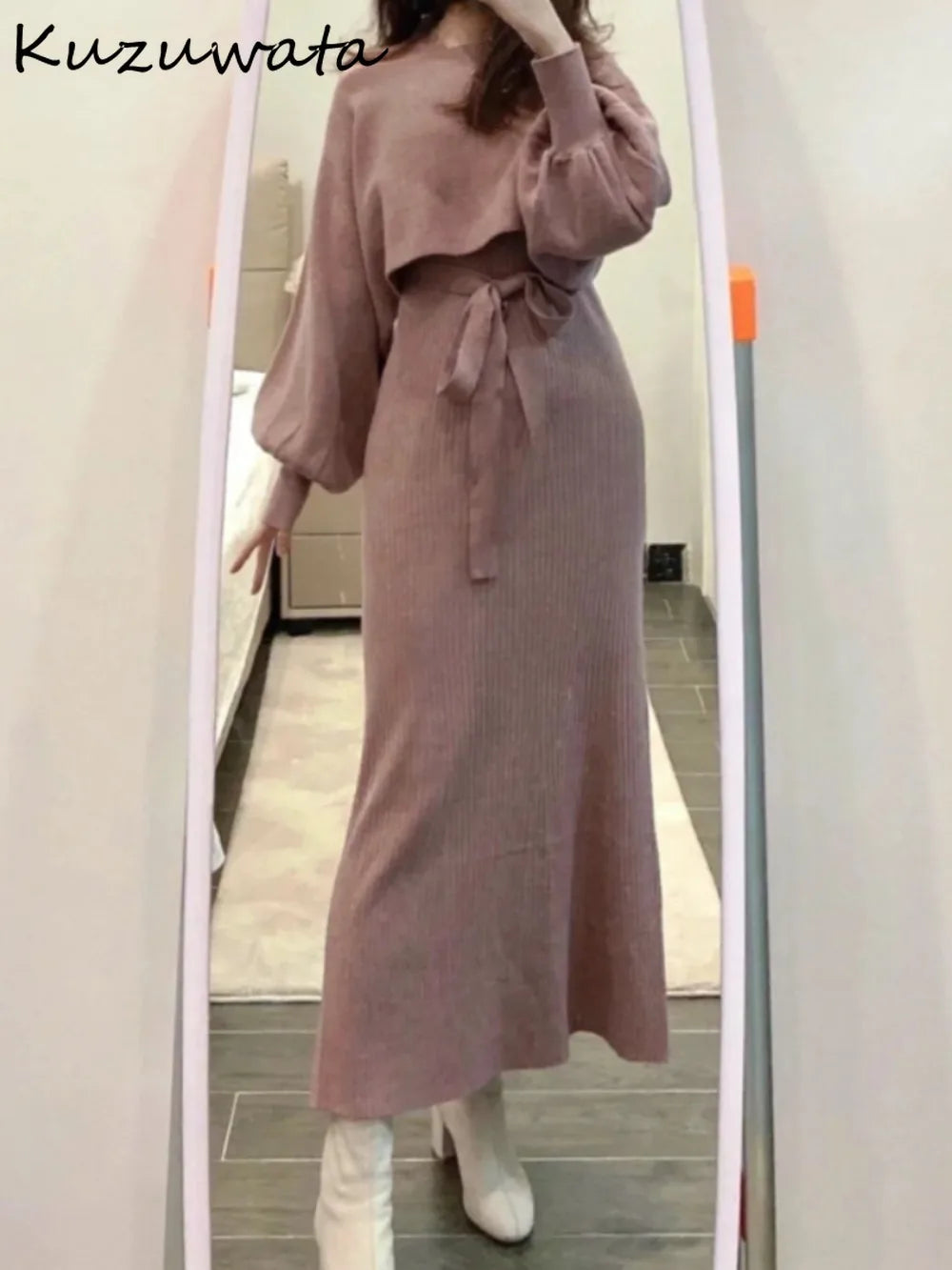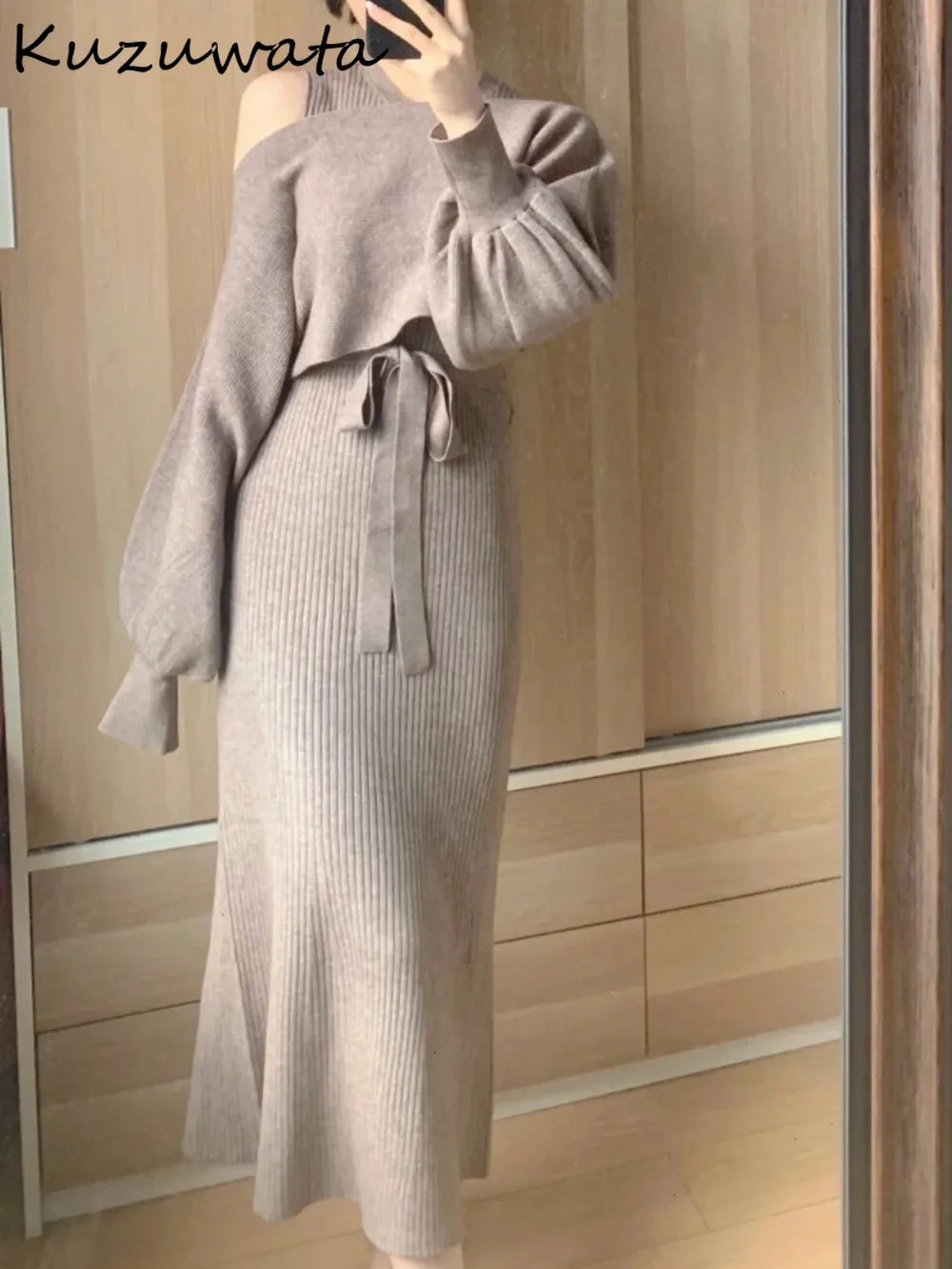 Kuzuwata Sweet Bohemian Knit Off Shoulder Smock French Style Lace Up Set Puff Sleeve Robe Japan Mermaid Fairy Suit Slim Dresses
