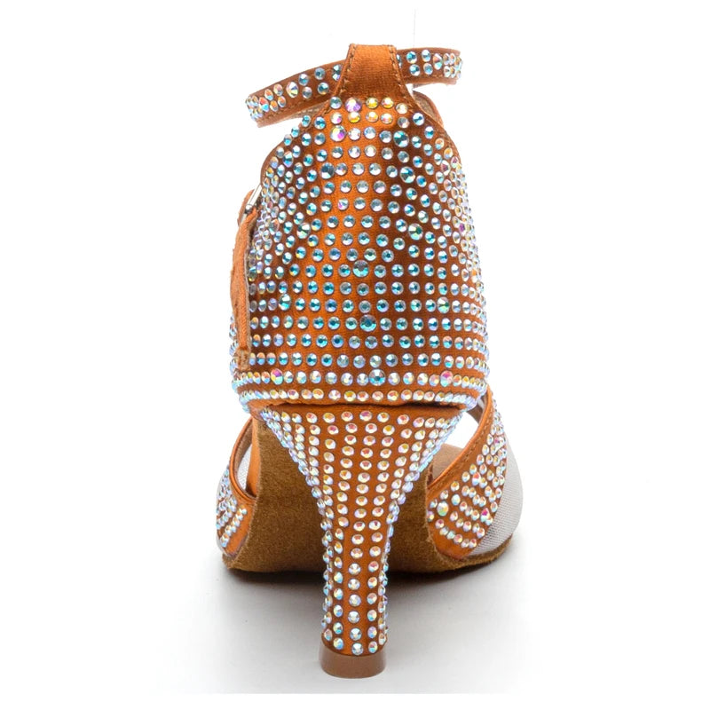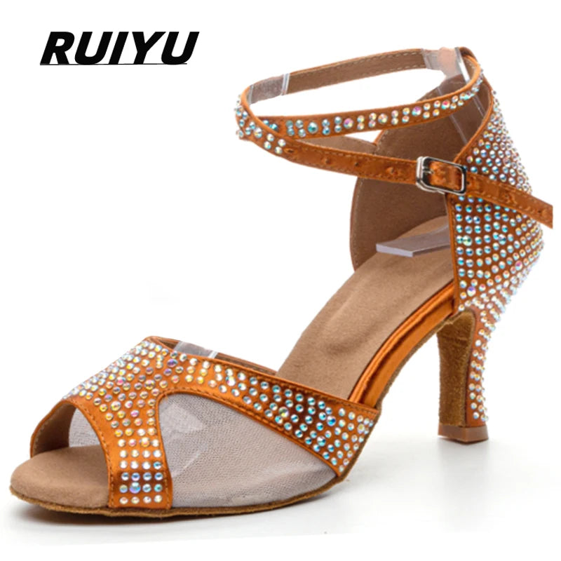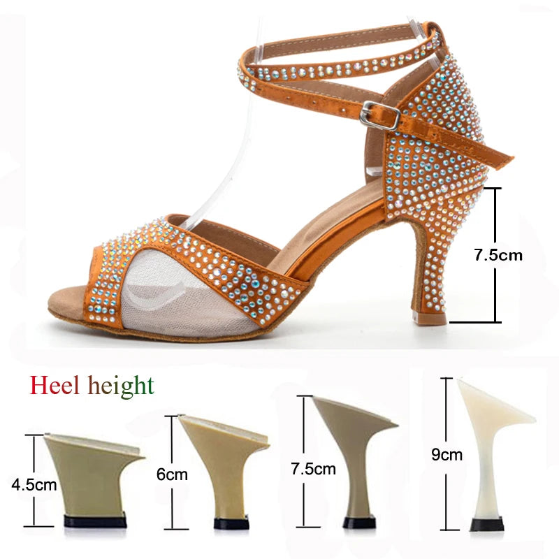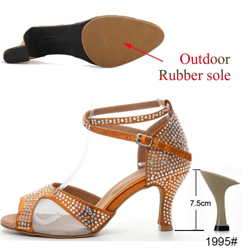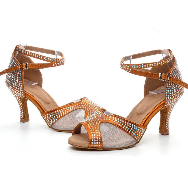 Latin Dance Shoes Women's Salsa Tango Ballroom Party High Heel Women's Shoes Bronze Satin Rhinestone Dance Sandals Summer