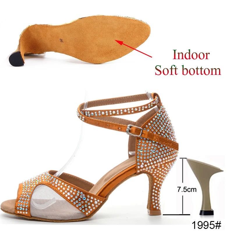 Latin Dance Shoes Women's Salsa Tango Ballroom Party High Heel Women's Shoes Bronze Satin Rhinestone Dance Sandals Summer