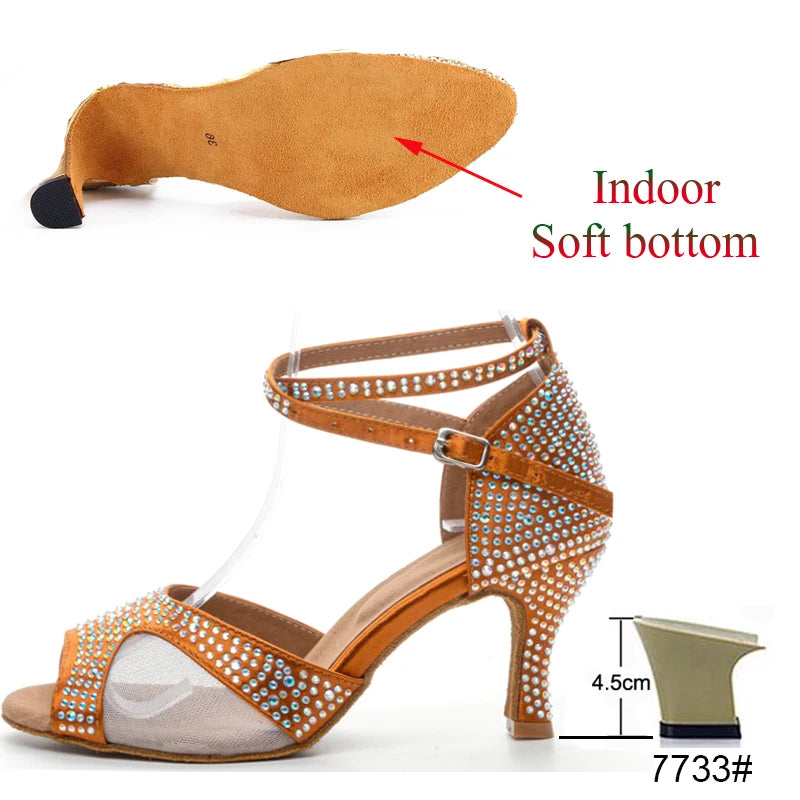 Latin Dance Shoes Women's Salsa Tango Ballroom Party High Heel Women's Shoes Bronze Satin Rhinestone Dance Sandals Summer