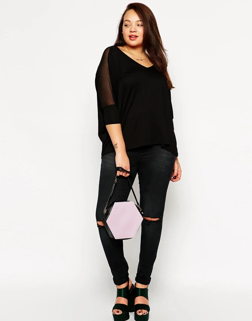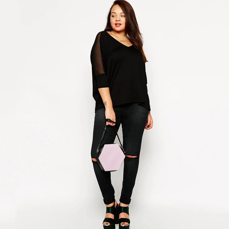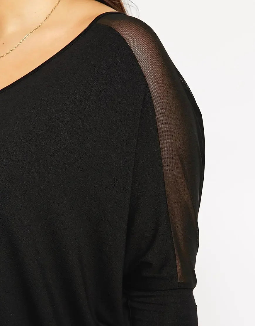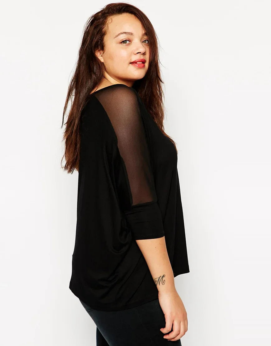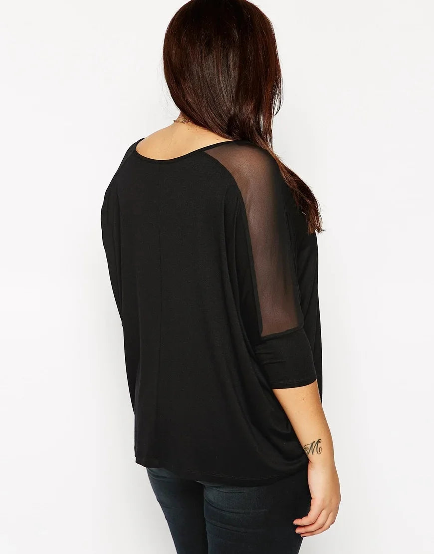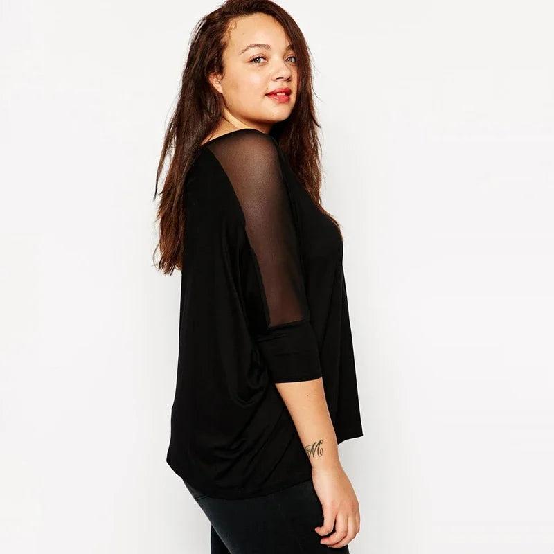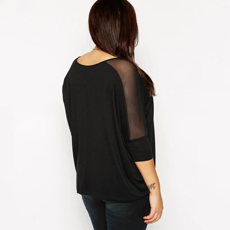 Plus Size Summer Elegant Loose Blouse Women 3/4 Batwing Sleeve Mesh Panel Black Loose Oversize Top Large Size Casual T-shirt 6XL
