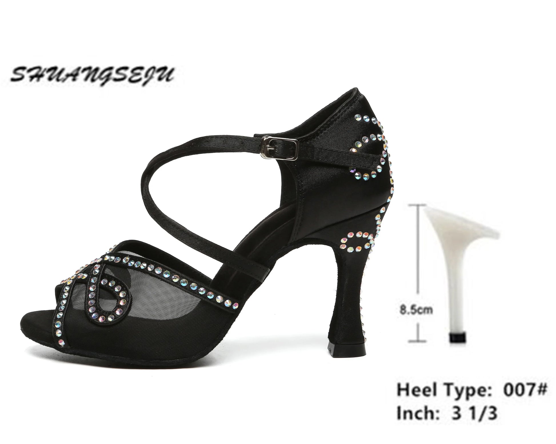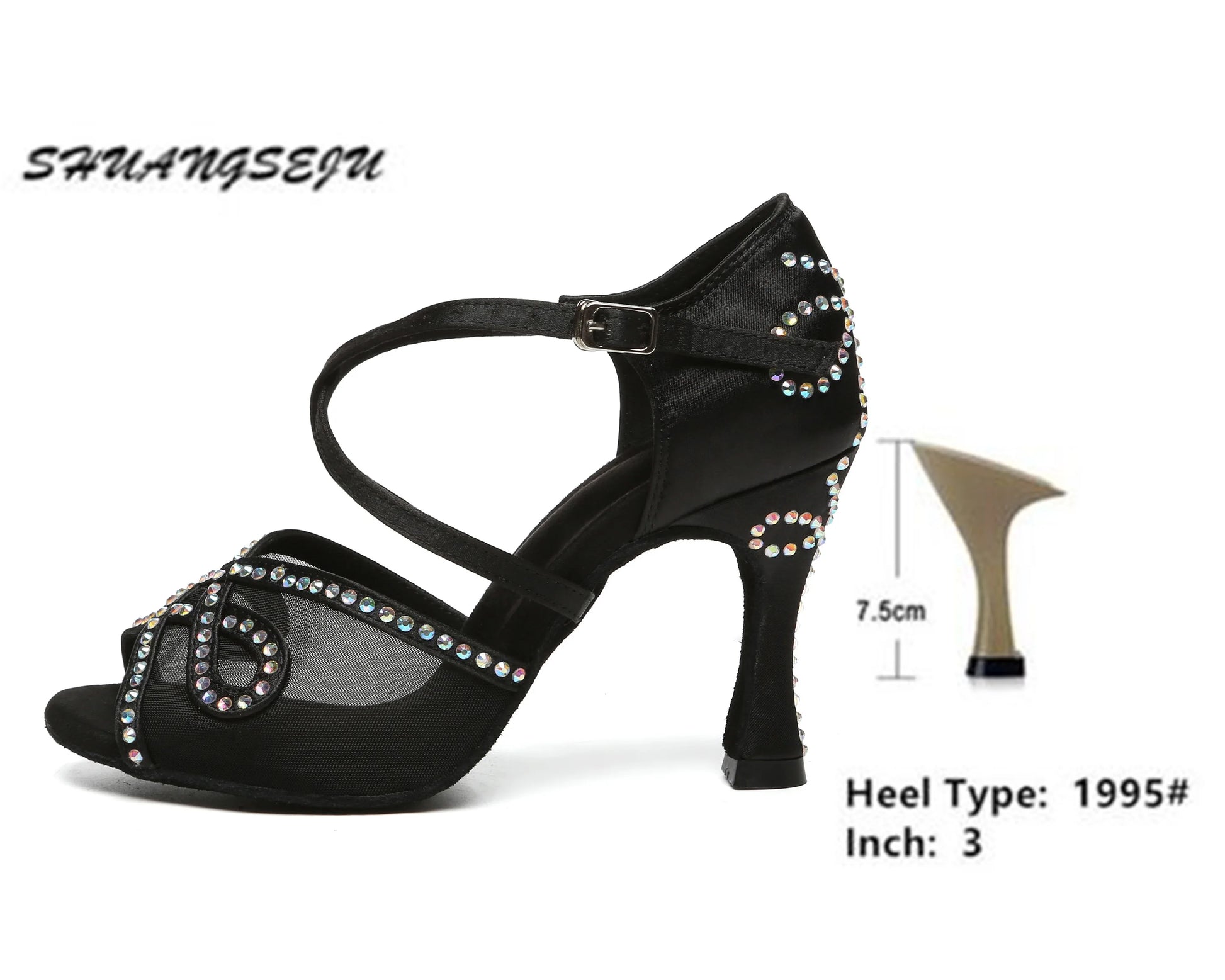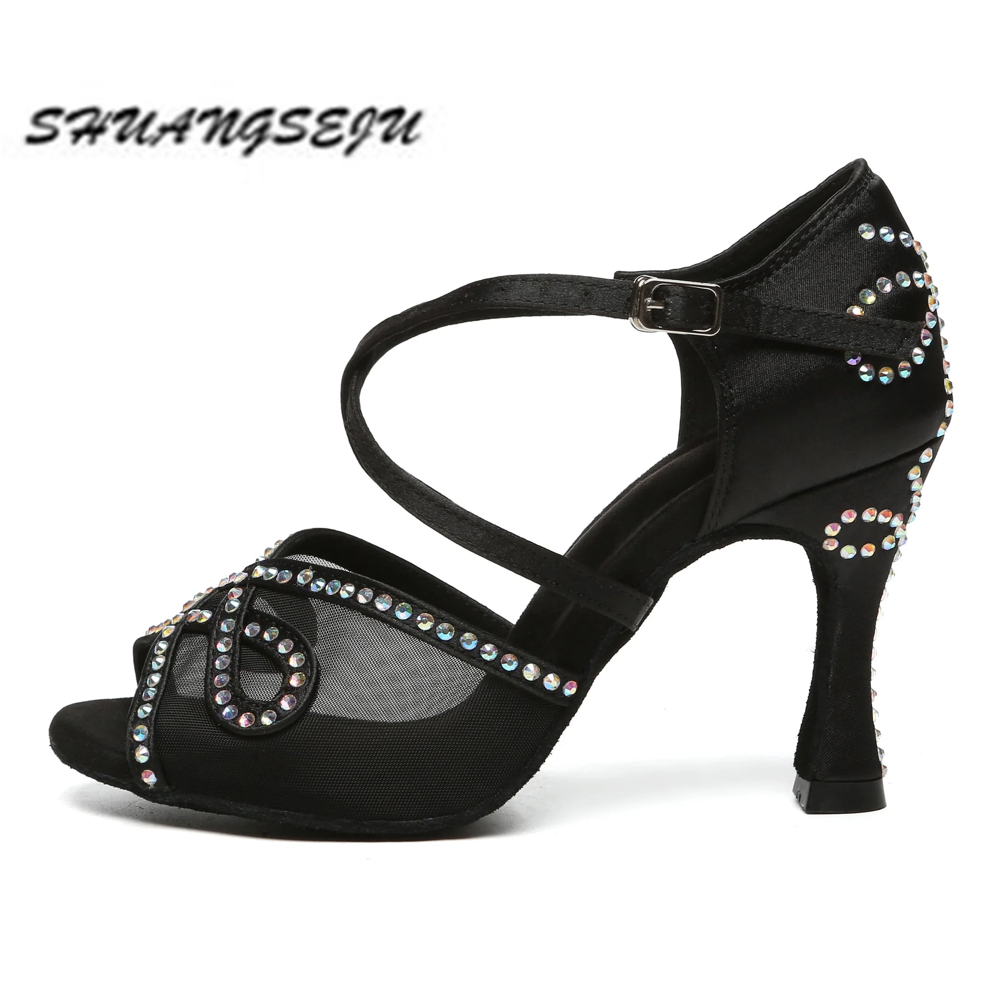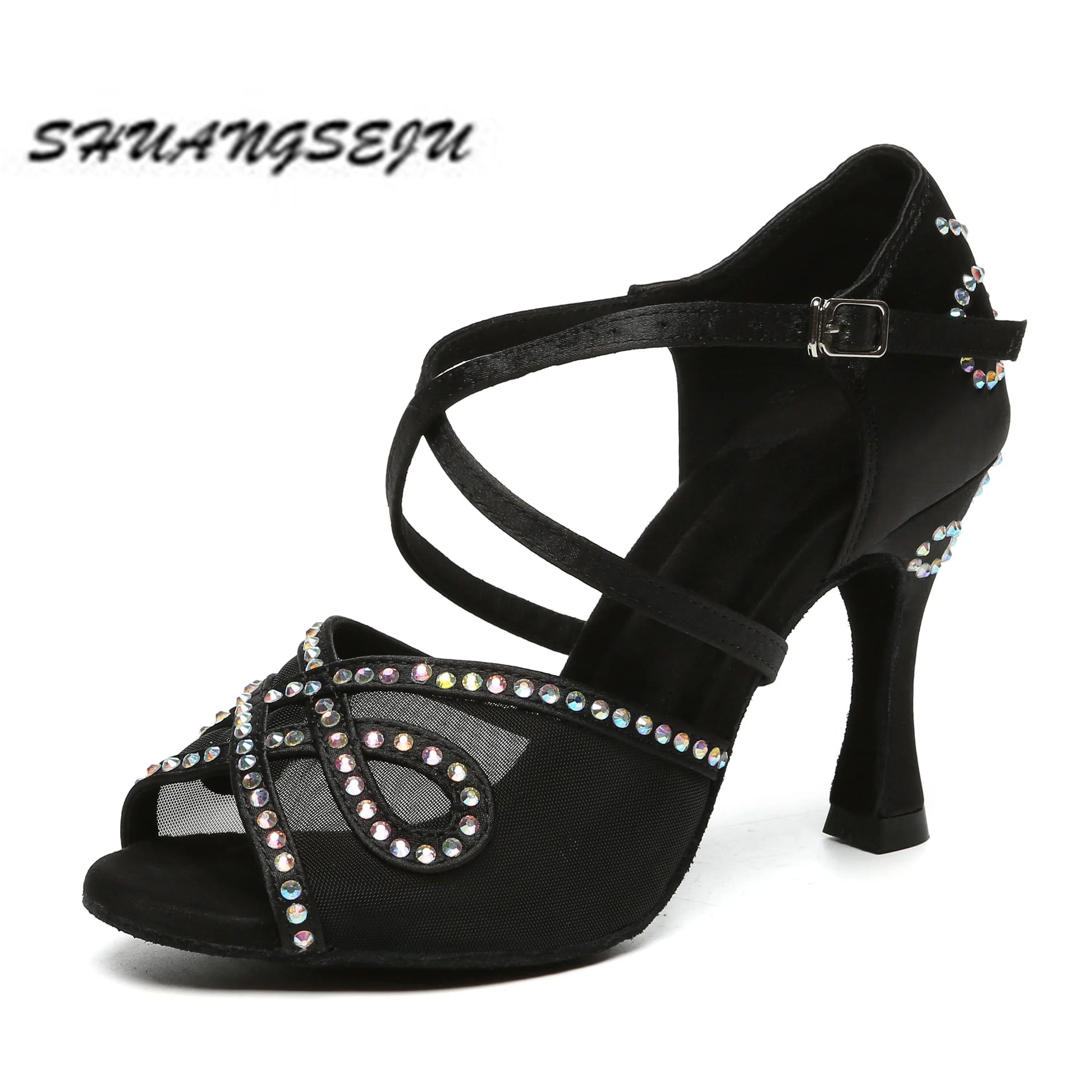 SHUANGSEJU New adult Latin dance Shoes Women Salsa Fashion shiny glass slipper Bachata performance shoes Black Everything 6-10cm