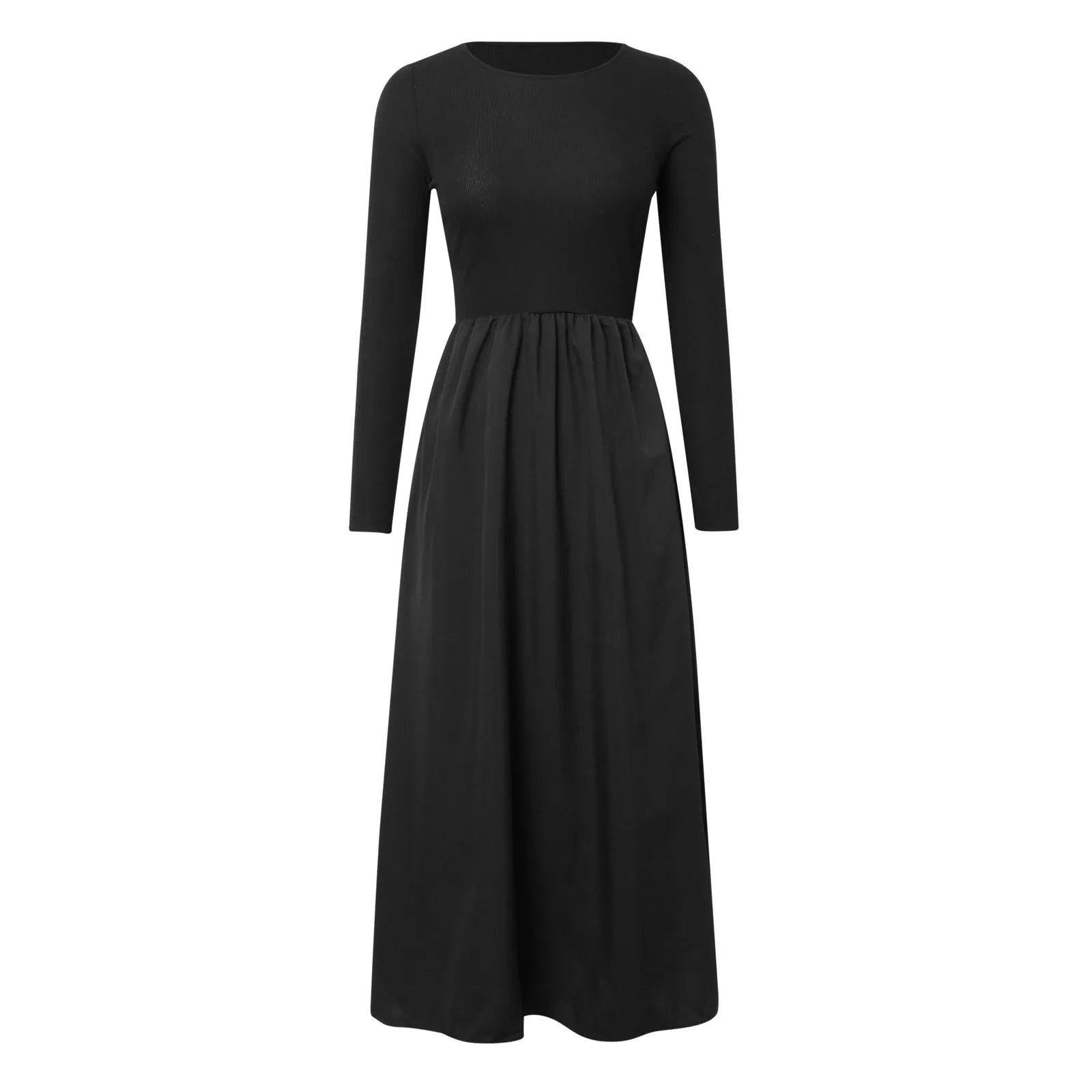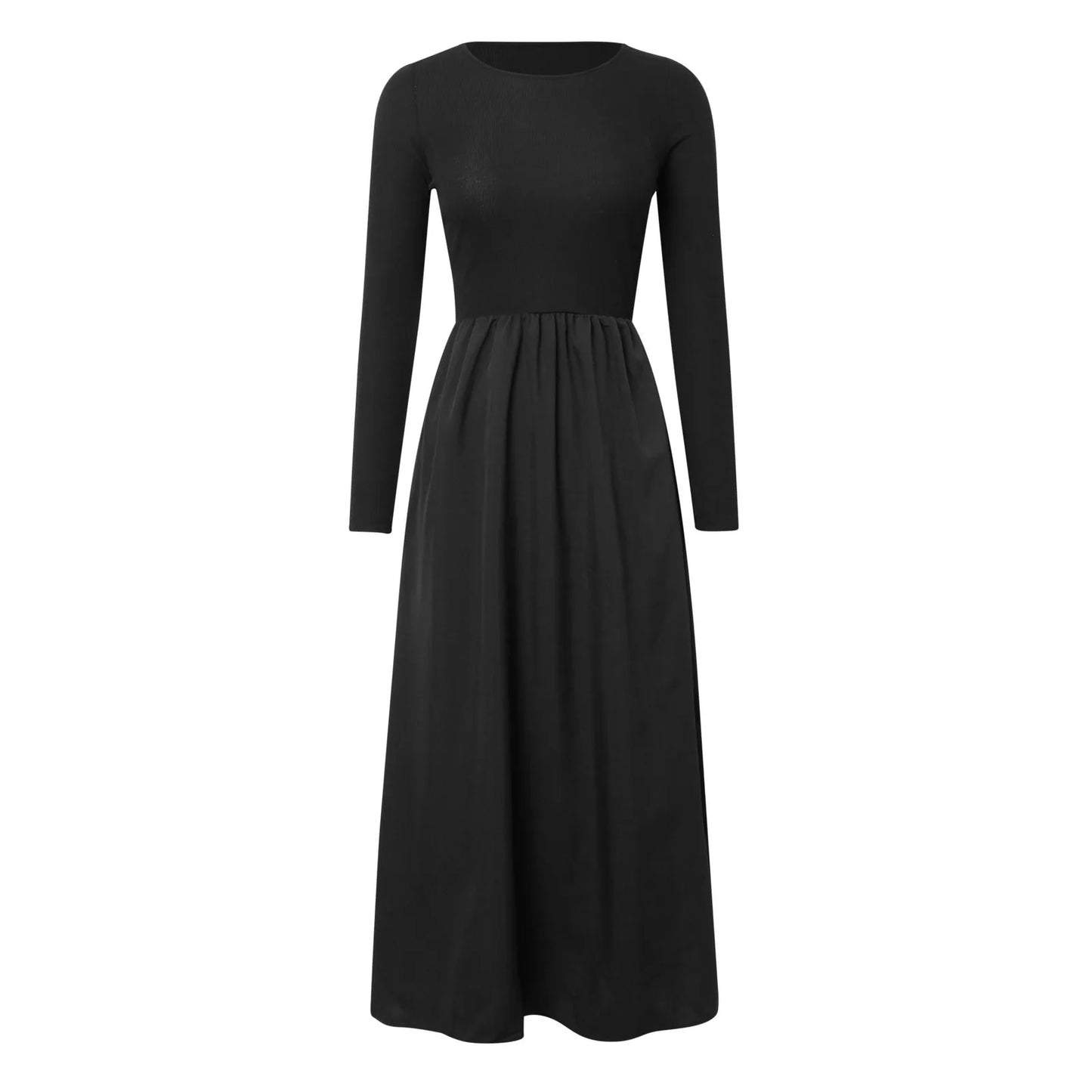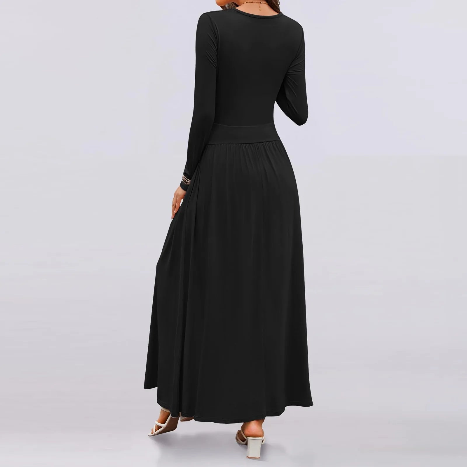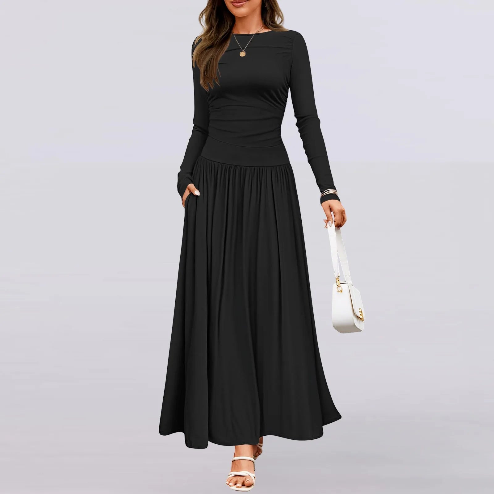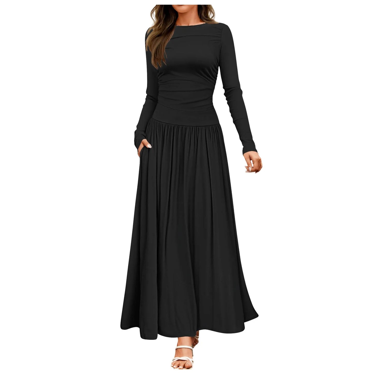 Casual dress, maxi dress, slim long sleeve, solid color, crewneck, stretch, ruched shoulder, two side pockets, pleated dress, swing flowy dress,knit dress, formal dress, fall dress, winter dress, casual basic style.