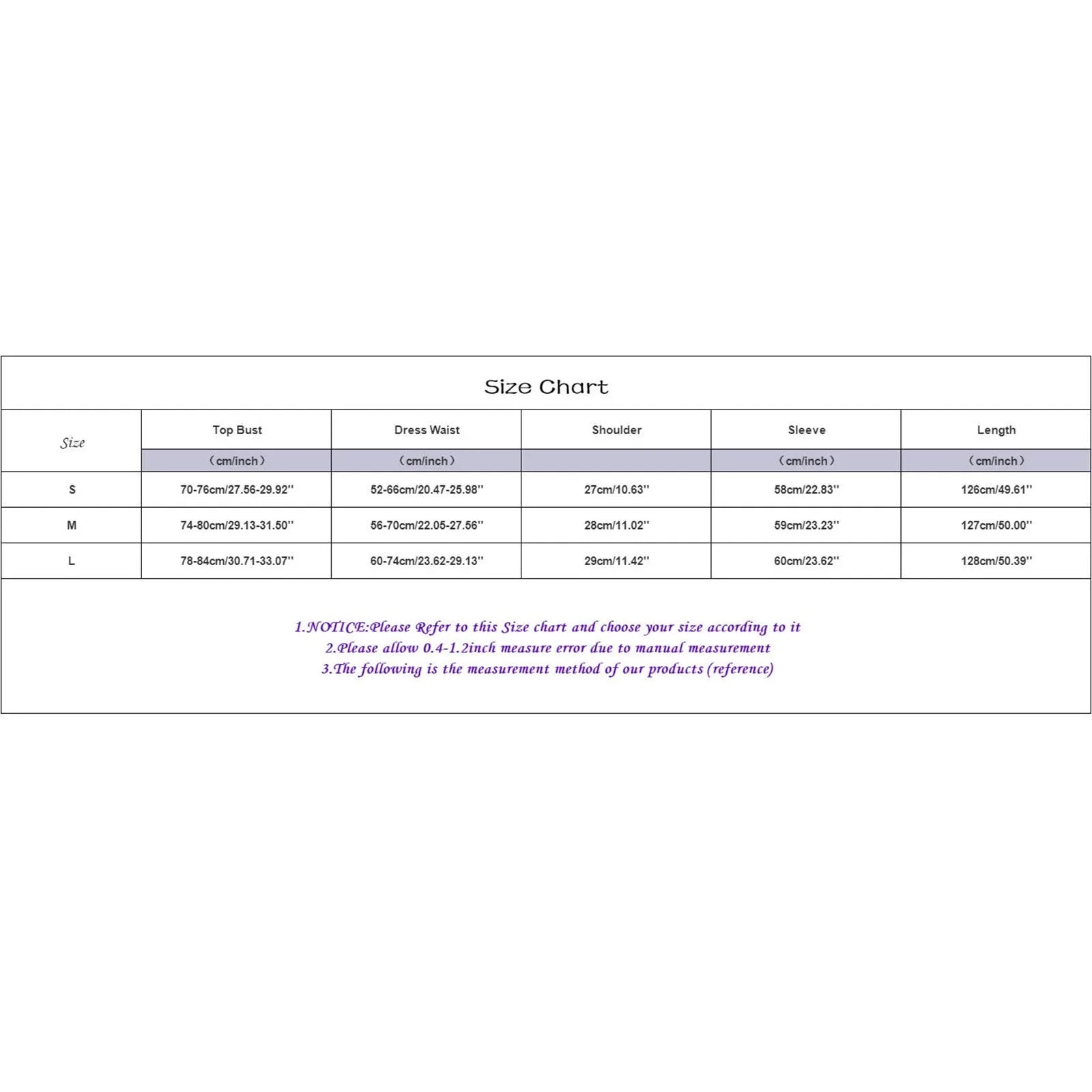 | Size:L | Top Bust:78-84cm/30.71-33.07'' | Dress Waist:60-74cm/23.62-29.13'' | Shoulder:29cm/11.42'' | Sleeve:60cm/23.62'' | Length:128cm/50.39'' |