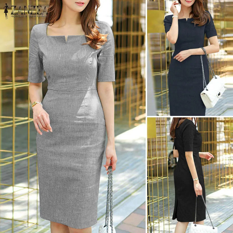 Summer Elegant Square Neck Dress ZANZEA Women Short Sleeve Slim Fit Vestidos Fashion Work Party Sundress Stylish Pencil Dresses